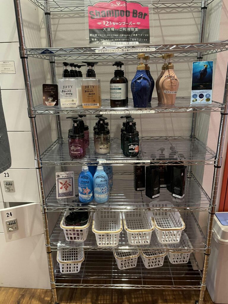 浴室入り口にはシャンプーバーが常設されています。備え付けのシャンプー等もありますが、ちょっといいシャンプーを使えるのはいいですね!